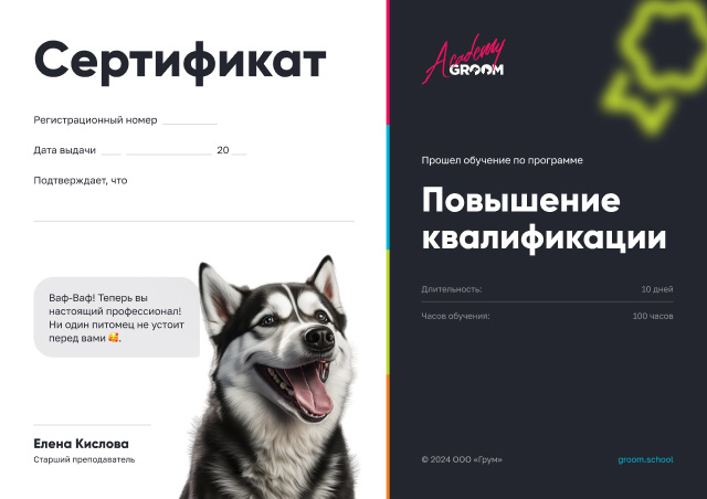 При успешном прохождении вы получаете диплом о профессиональной переподготовке по программе дополнительного профессионального образования «Груминг. Стрижка собак и кошек» Лицензия №20320 от 27 марта 2020 года. Выдана Министерством образования и молодежной политики Свердловской области.